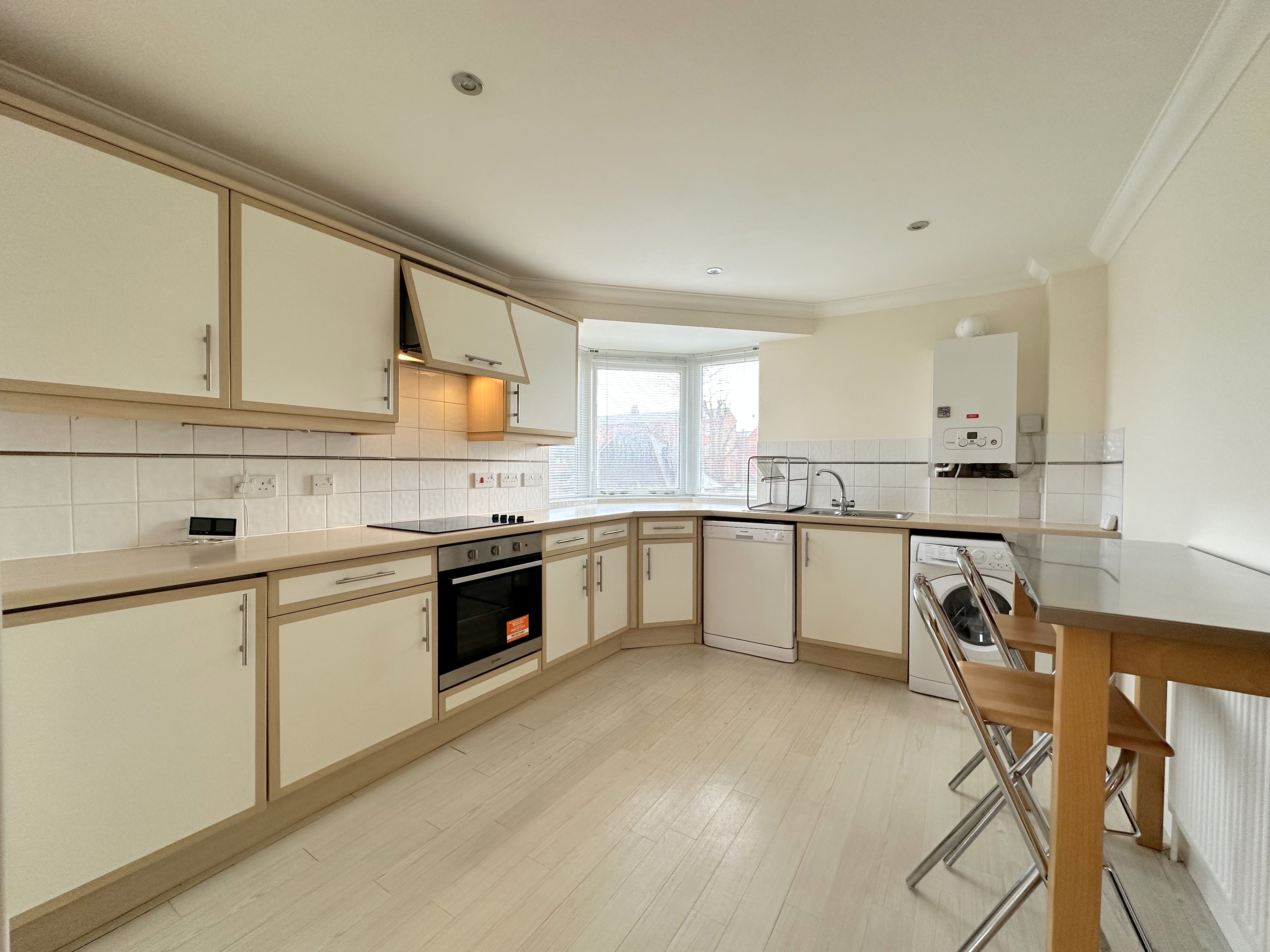 The standout feature is the impressive dual-aspect living room — a particularly generous reception space that comfortably accommodates both lounge and dining areas. The attractive bay window enhances the sense of space while allowing natural light to flood the room, creating a welcoming and versatile living environment rarely found in one-bedroom apartments.